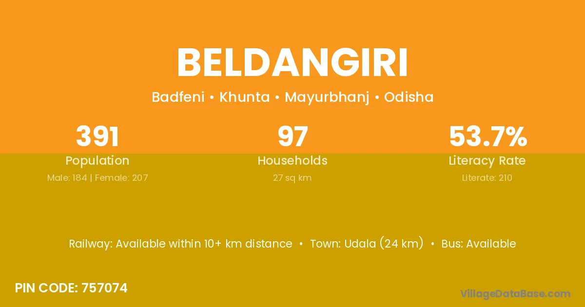 Udala (24 km) is the nearest town to Beldangiri village for major economic activities and is located approximately 24 km away.