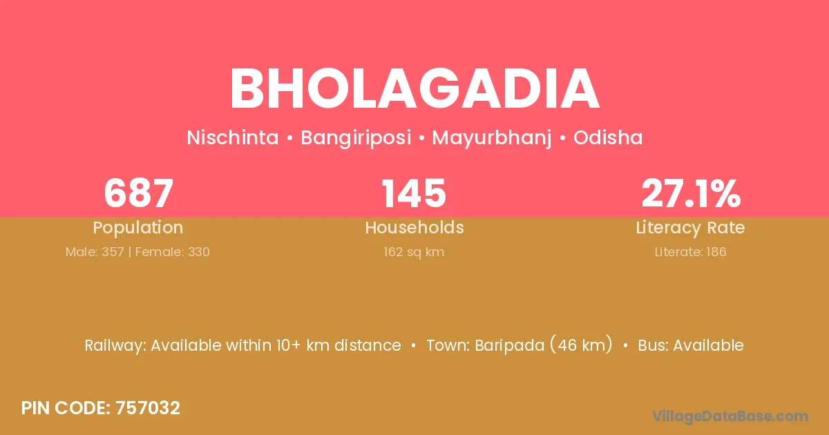 Udala (29 km) is the nearest town to Bholagadia village for major economic activities and is located approximately 29 km away.