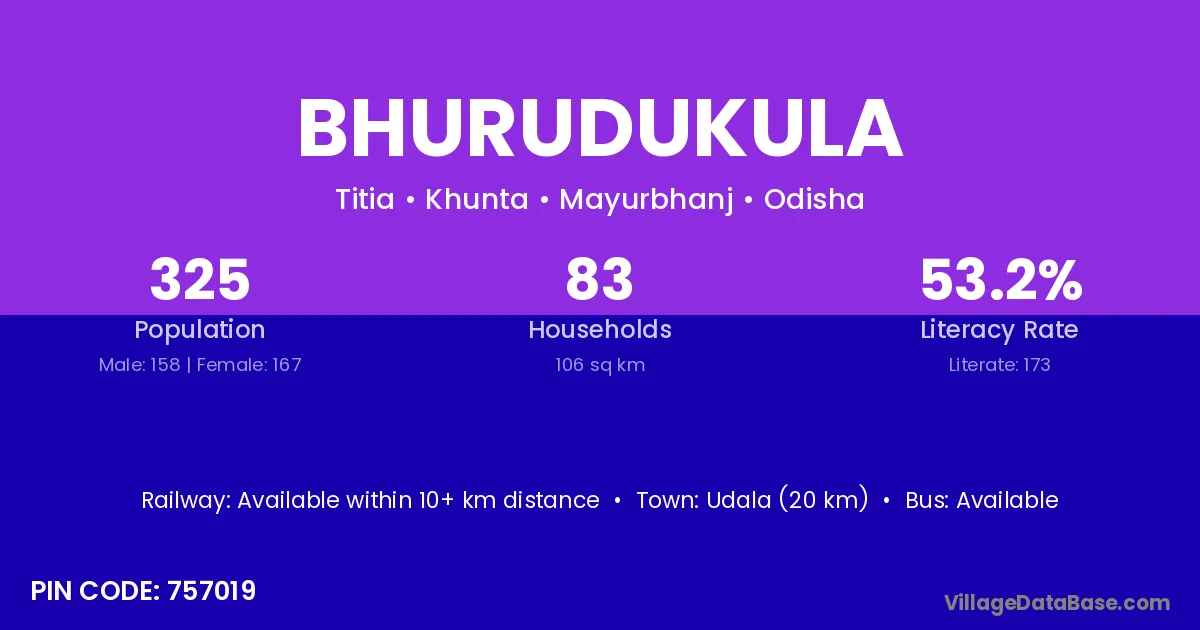 Udala (20 km) is the nearest town to Bhurudukula village for major economic activities and is located approximately 20 km away.