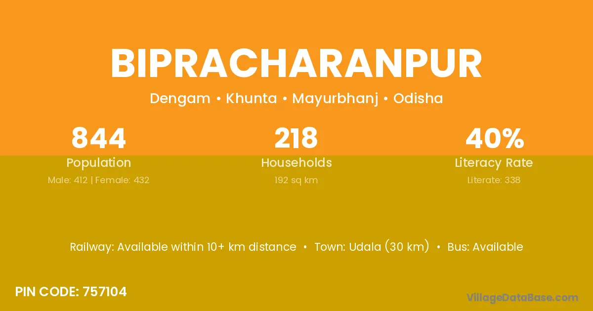 Udala (30 km) is the nearest town to Bipracharanpur village for major economic activities and is located approximately 30 km away.