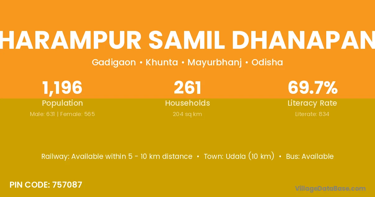 Udala (10 km) is the nearest town to Dharampur Samil Dhanapana village for major economic activities and is located approximately 10 km away.