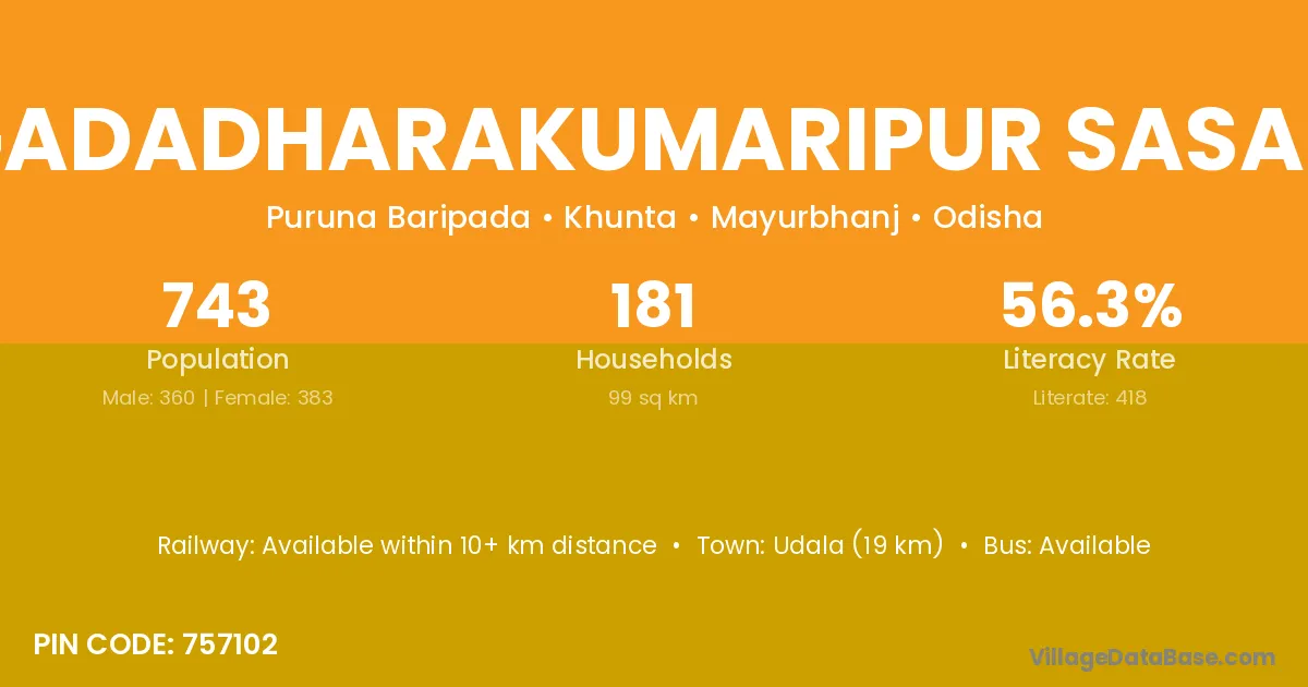 Gadadharakumaripur Sasan village has a total population of 743 people, of which 360 are males and 383 are females.