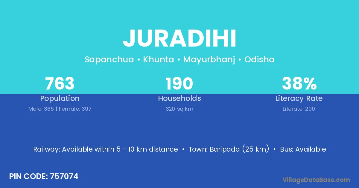 Baripada (25 km) is the nearest town to Juradihi village for major economic activities and is located approximately 25 km away.