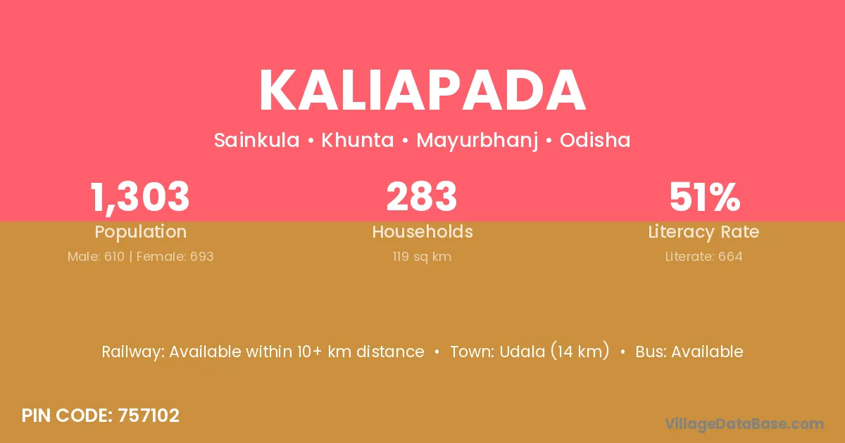 Kaliapada village has a total population of 1,303 people, of which 610 are males and 693 are females.