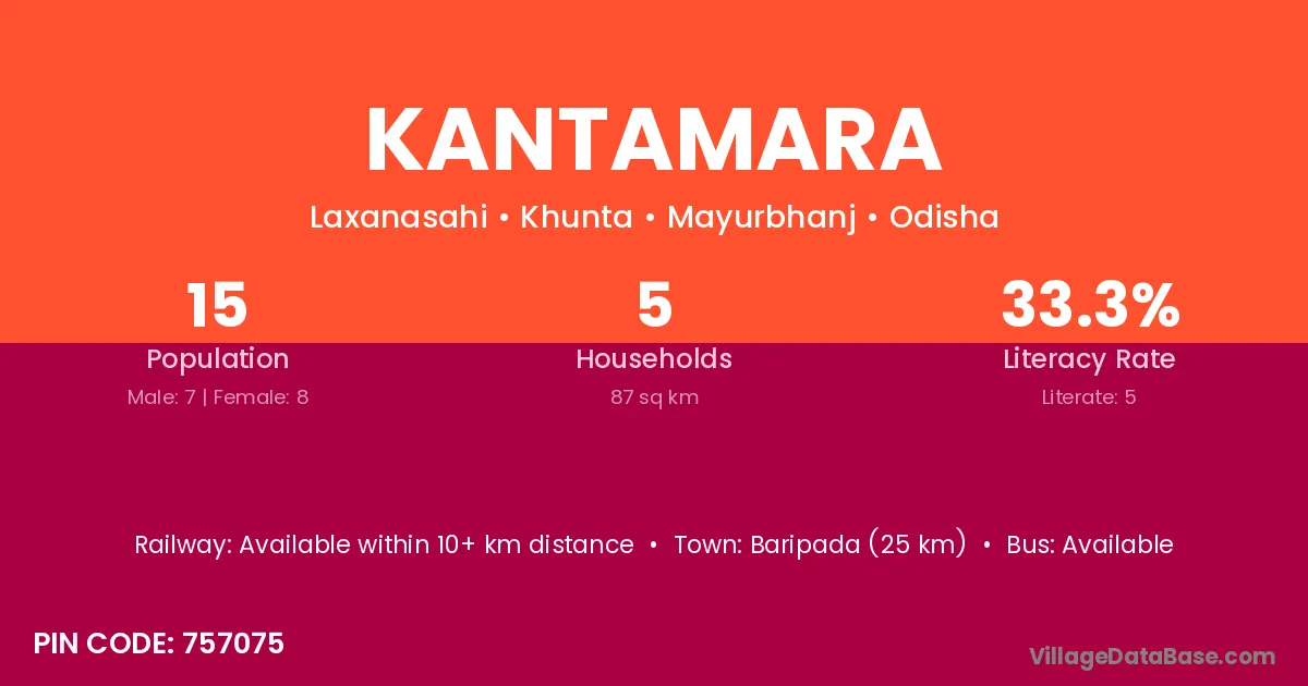 Kantamara village has a total population of 15 people, of which 7 are males and 8 are females.