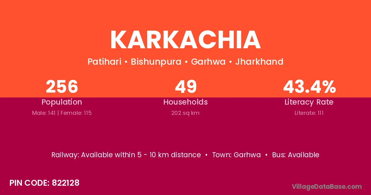 The literacy rate of Karkachia village is 56.61%. Male literacy stands at 63.38% and female literacy at 49.29%.