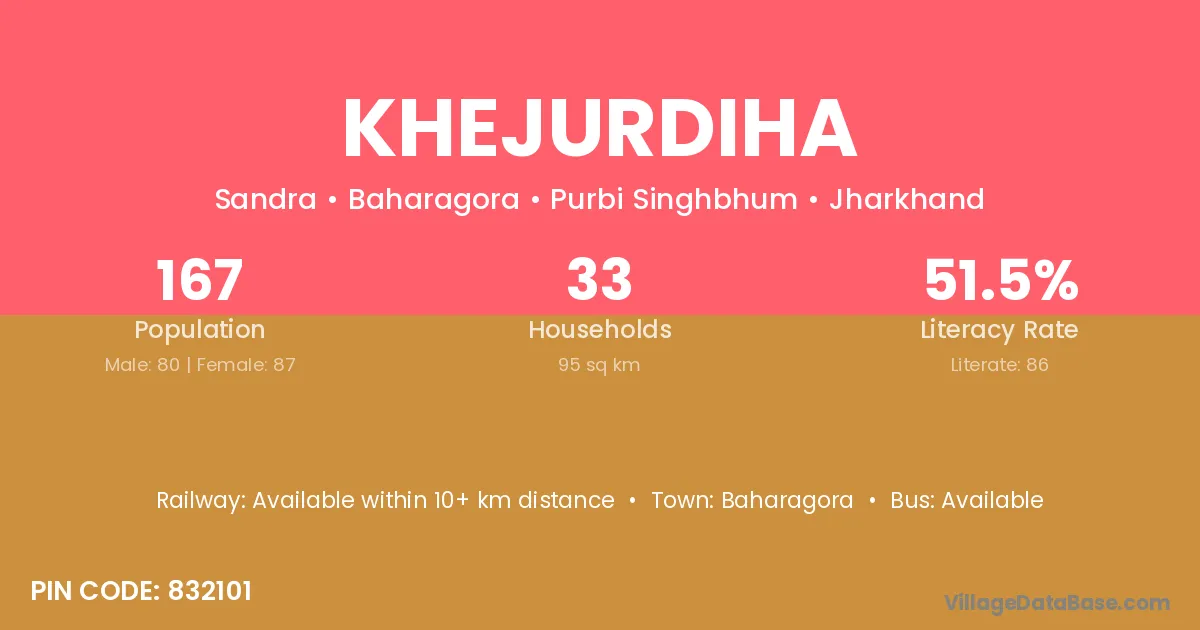 Udala (19 km) is the nearest town to Khejurdiha village for major economic activities and is located approximately 19 km away.