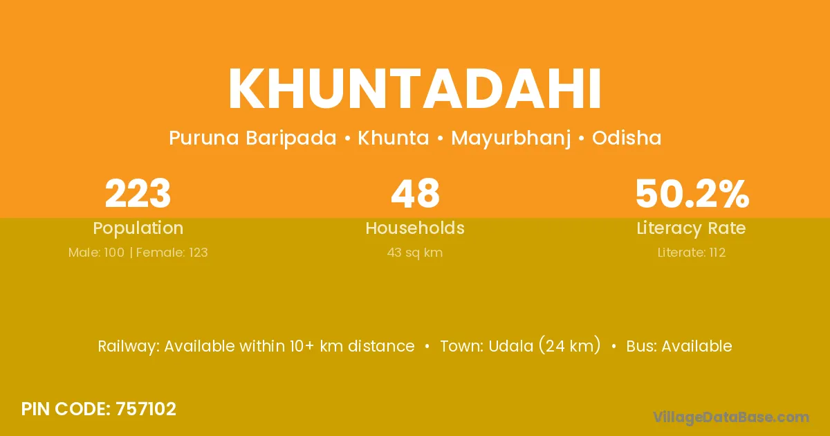 Udala (24 km) is the nearest town to Khuntadahi village for major economic activities and is located approximately 24 km away.