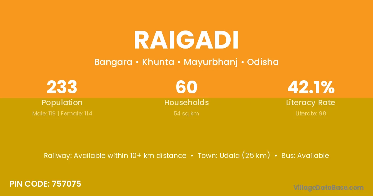 Raigadi village has a total population of 233 people, of which 119 are males and 114 are females.