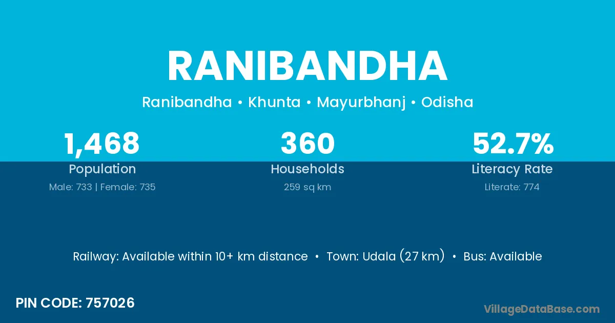 Udala (27 km) is the nearest town to Ranibandha village for major economic activities and is located approximately 27 km away.