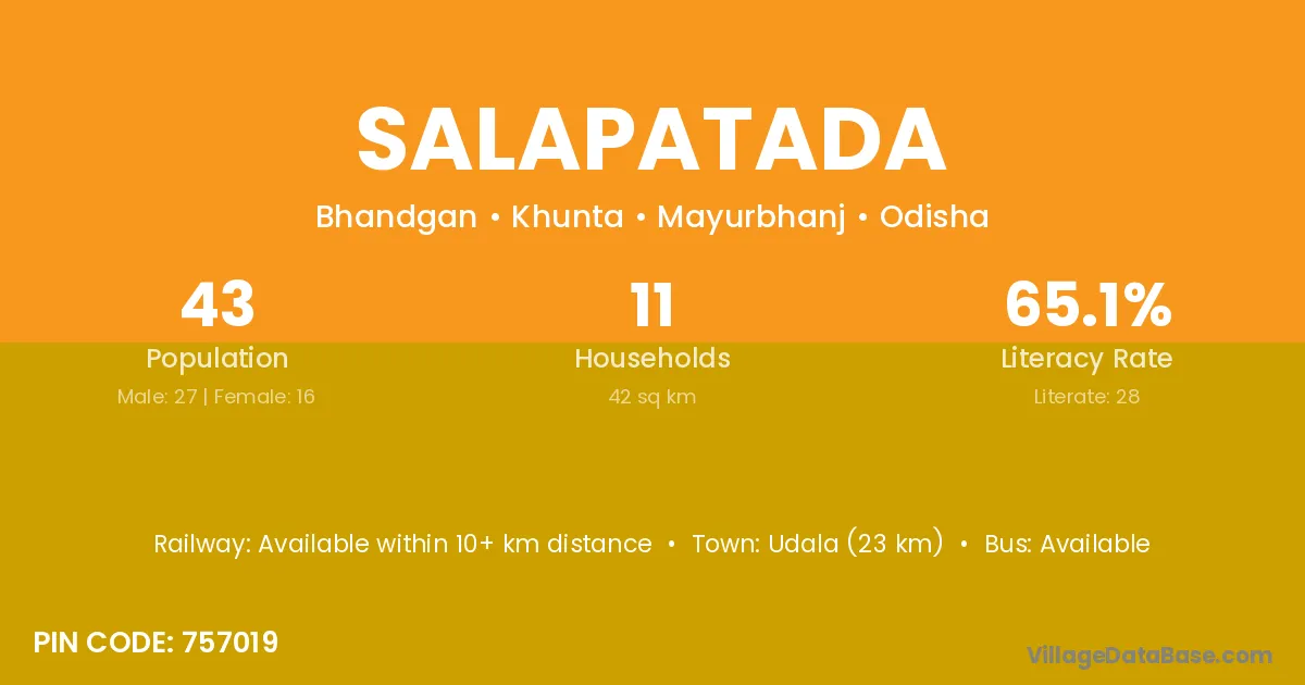 Udala (23 km) is the nearest town to Salapatada village for major economic activities and is located approximately 23 km away.