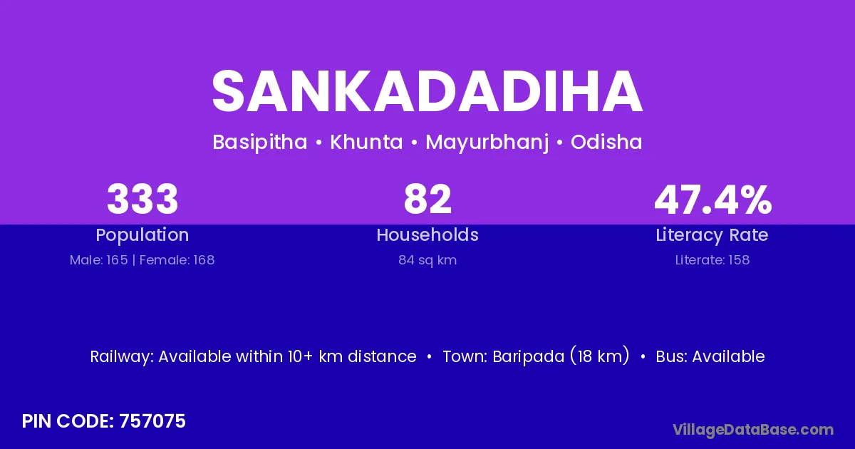 Baripada (18 km) is the nearest town to Sankadadiha village for major economic activities and is located approximately 18 km away.