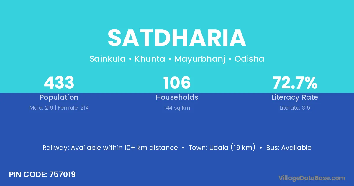 Udala (19 km) is the nearest town to Satdharia village for major economic activities and is located approximately 19 km away.