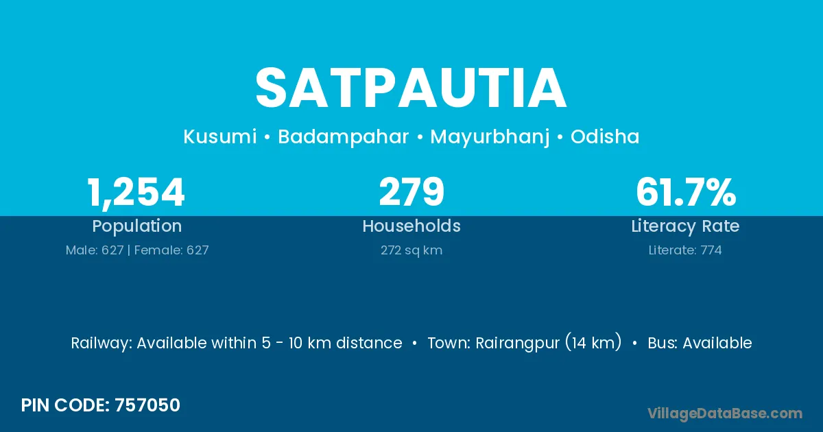 Udala (22 km) is the nearest town to Satpautia village for major economic activities and is located approximately 22 km away.