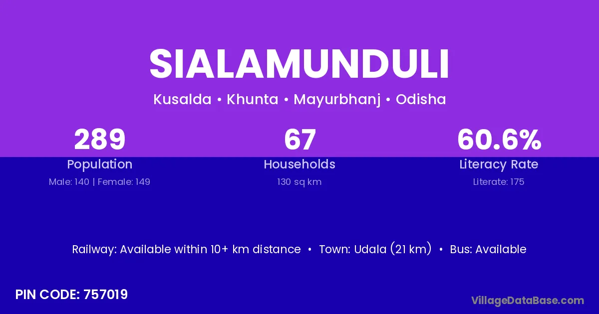 Udala (21 km) is the nearest town to Sialamunduli village for major economic activities and is located approximately 21 km away.