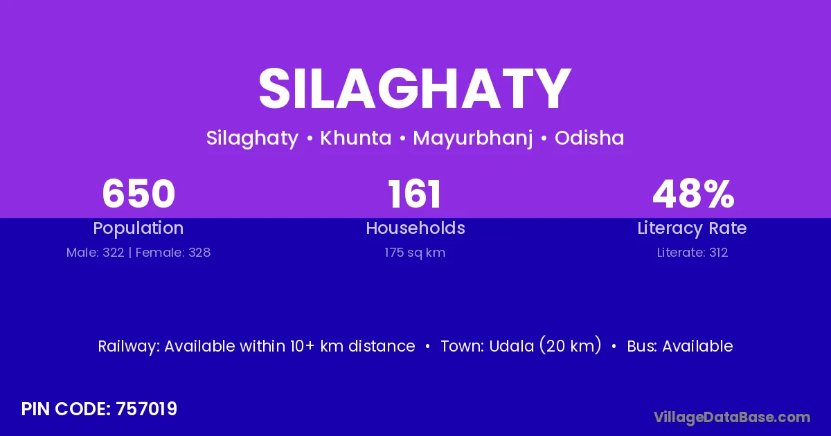 Udala (20 km) is the nearest town to Silaghaty village for major economic activities and is located approximately 20 km away.