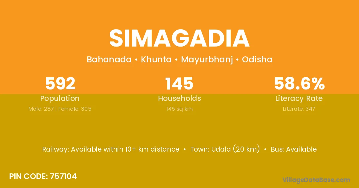Udala (20 km) is the nearest town to Simagadia village for major economic activities and is located approximately 20 km away.