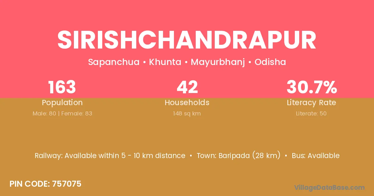Sirishchandrapur village has a total population of 163 people, of which 80 are males and 83 are females.