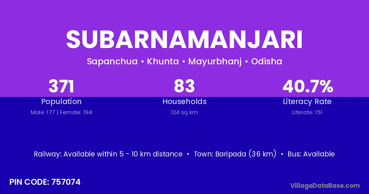 Baripada (36 km) is the nearest town to Subarnamanjari village for major economic activities and is located approximately 36 km away.