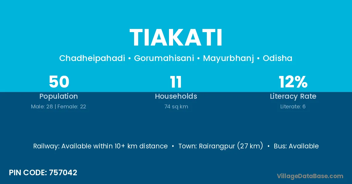 Tiakati village has a total population of 78 people, of which 38 are males and 40 are females.