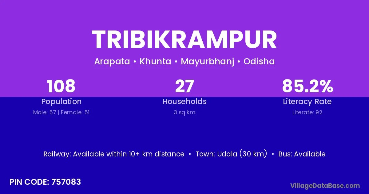 Udala (30 km) is the nearest town to Tribikrampur village for major economic activities and is located approximately 30 km away.