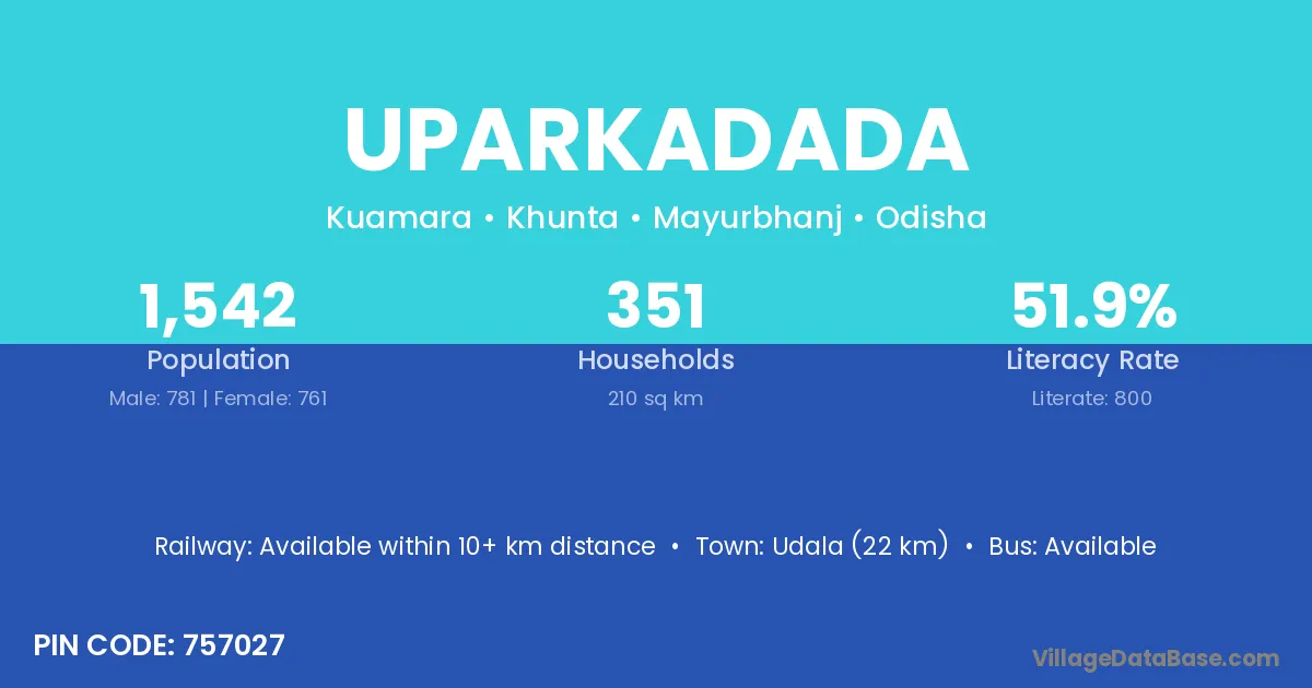 Udala (22 km) is the nearest town to Uparkadada village for major economic activities and is located approximately 22 km away.