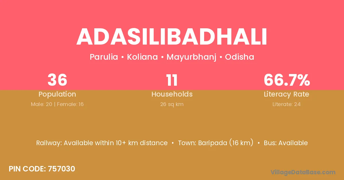 Baripada (16 km) is the nearest town to Adasilibadhali village for major economic activities and is located approximately 16 km away.
