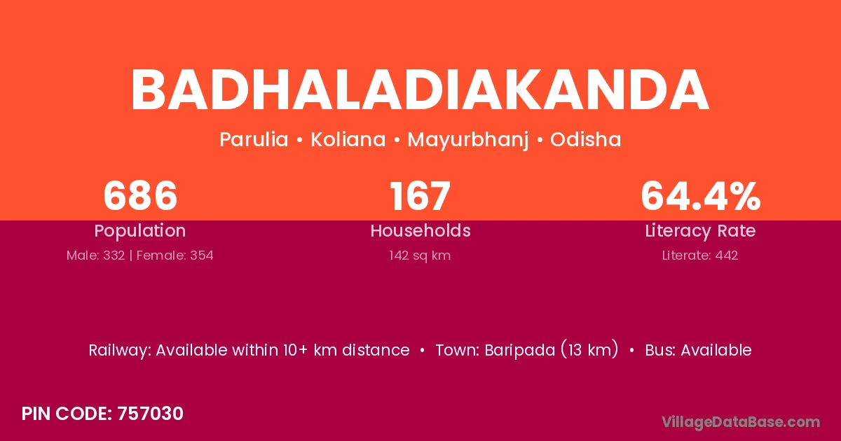 Baripada (13 km) is the nearest town to Badhaladiakanda village for major economic activities and is located approximately 13 km away.