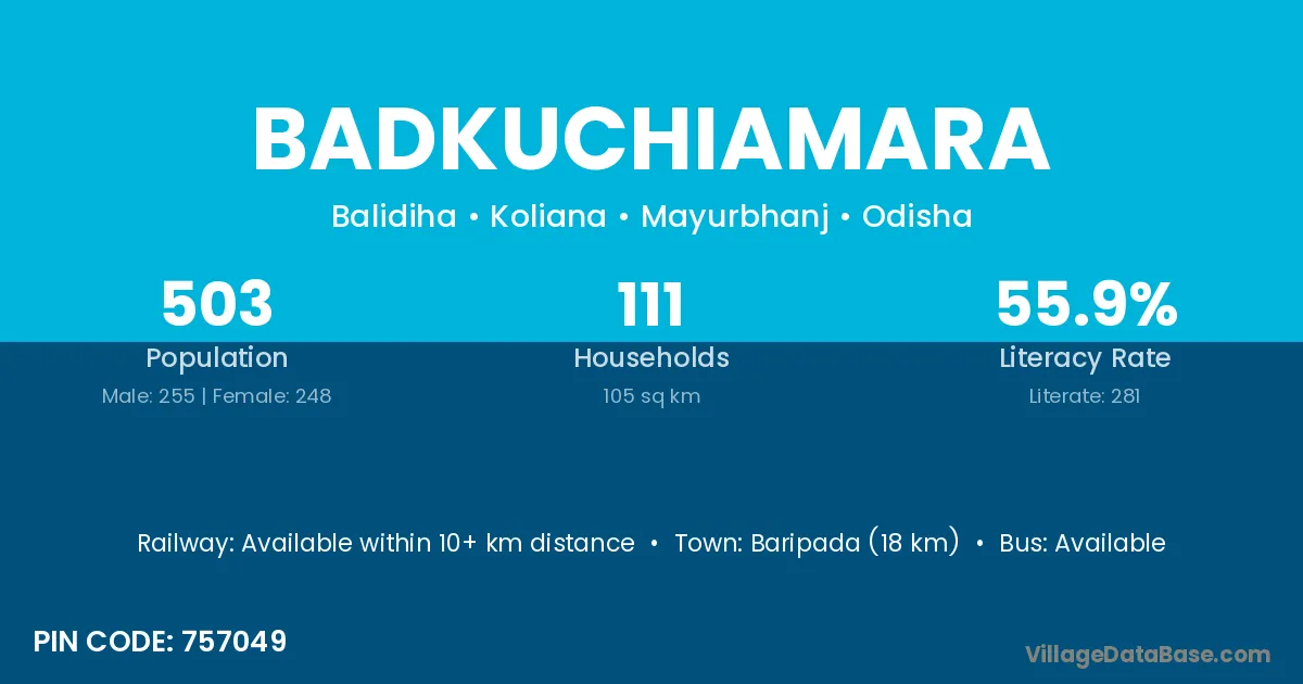 Baripada (18 km) is the nearest town to Badkuchiamara village for major economic activities and is located approximately 18 km away.
