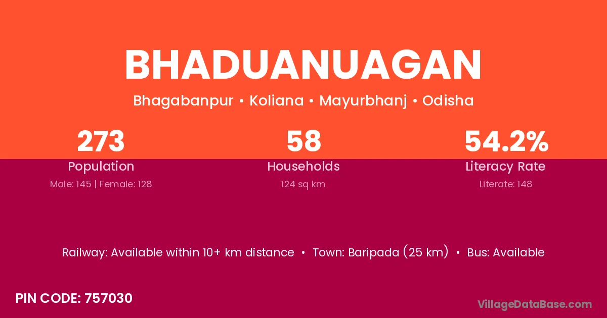 Baripada (25 km) is the nearest town to Bhaduanuagan village for major economic activities and is located approximately 25 km away.