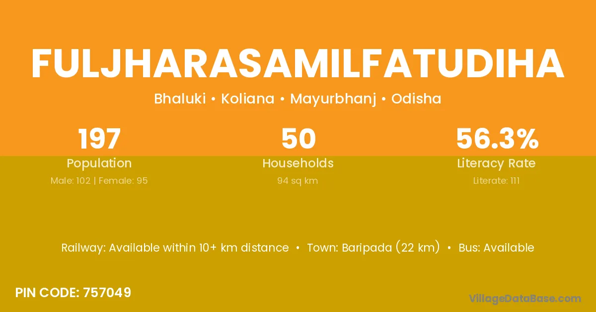 Baripada (22 km) is the nearest town to Fuljharasamilfatudiha village for major economic activities and is located approximately 22 km away.