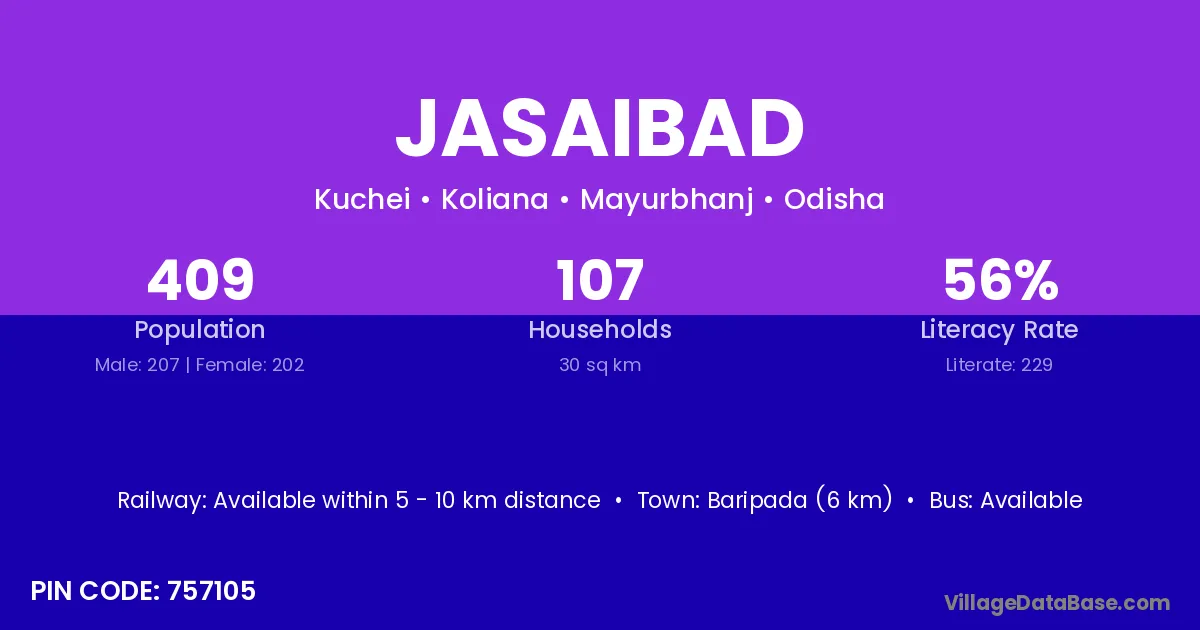 Baripada (6 km) is the nearest town to Jasaibad village for major economic activities and is located approximately 6 km away.