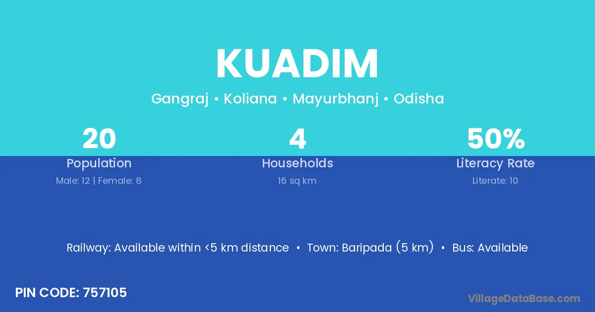 Baripada (5 km) is the nearest town to Kuadim village for major economic activities and is located approximately 5 km away.