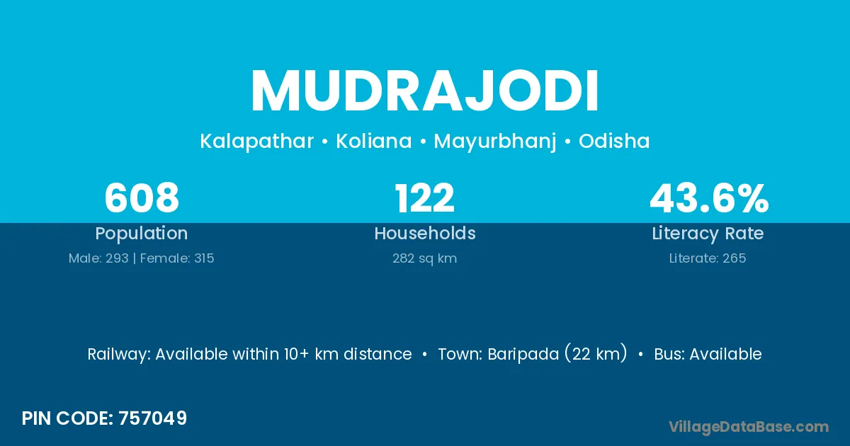 Baripada (22 km) is the nearest town to Mudrajodi village for major economic activities and is located approximately 22 km away.