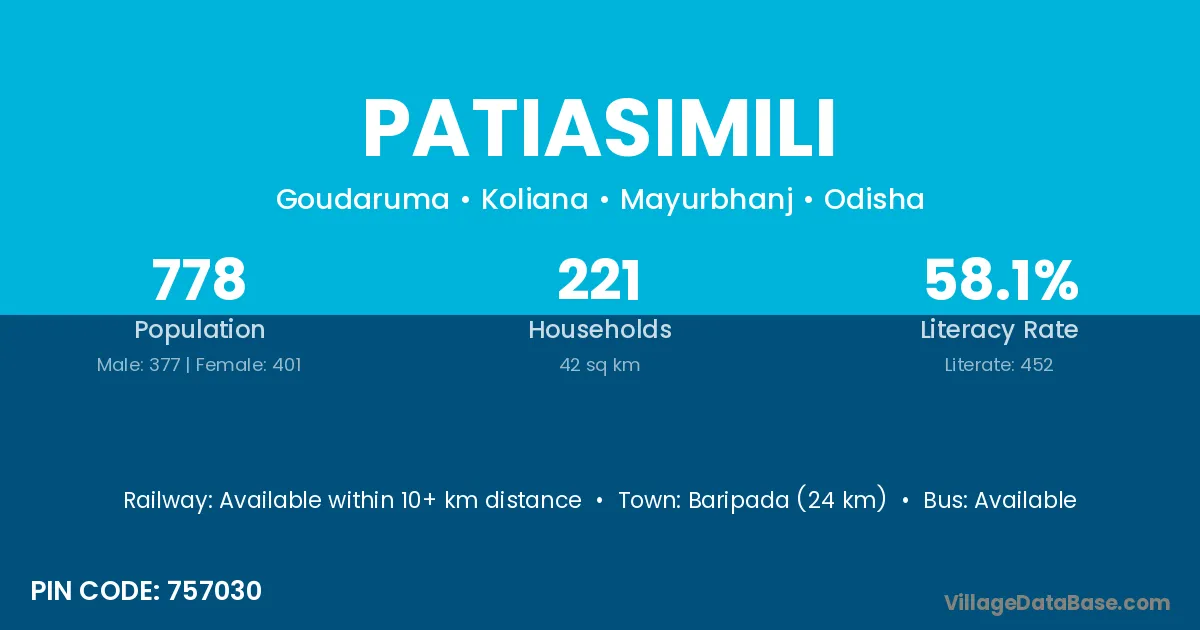 Baripada (24 km) is the nearest town to Patiasimili village for major economic activities and is located approximately 24 km away.