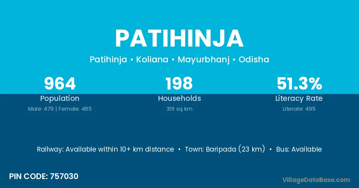 Baripada (23 km) is the nearest town to Patihinja village for major economic activities and is located approximately 23 km away.