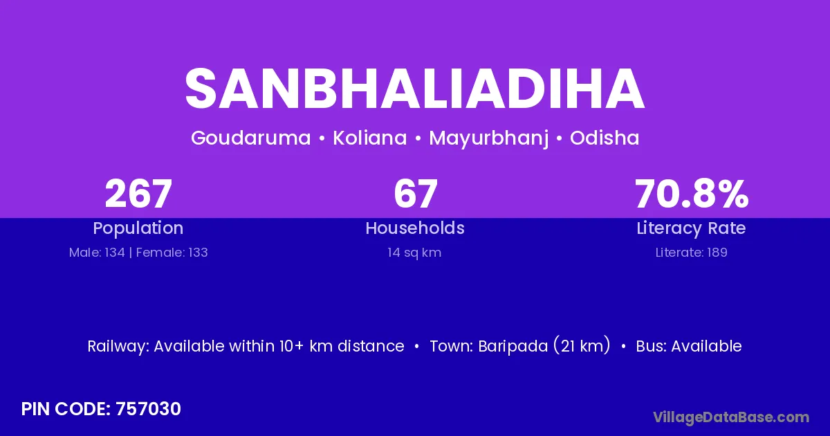 Baripada (21 km) is the nearest town to Sanbhaliadiha village for major economic activities and is located approximately 21 km away.