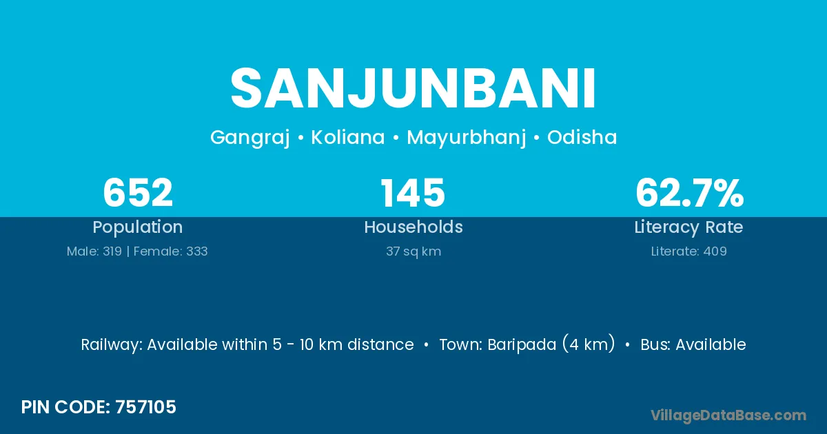 Baripada (4 km) is the nearest town to Sanjunbani village for major economic activities and is located approximately 4 km away.