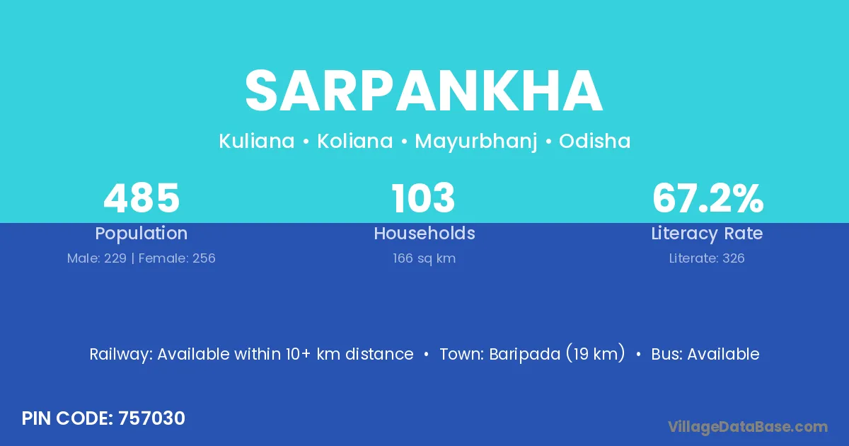 Baripada (19 km) is the nearest town to Sarpankha village for major economic activities and is located approximately 19 km away.