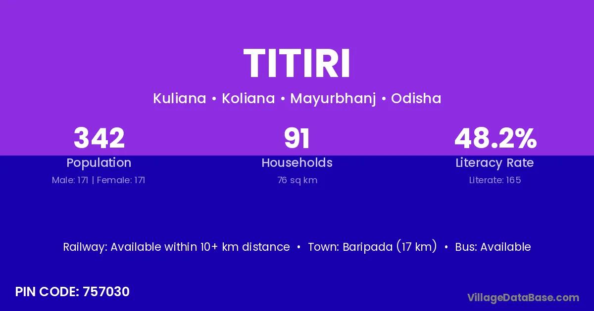 Baripada (17 km) is the nearest town to Titiri village for major economic activities and is located approximately 17 km away.