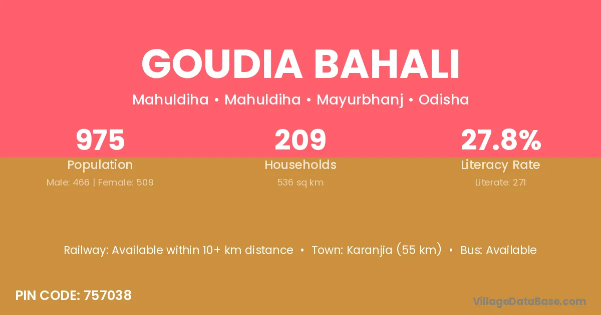 Karanjia (55 km) is the nearest town to Goudia Bahali village for major economic activities and is located approximately 55 km away.