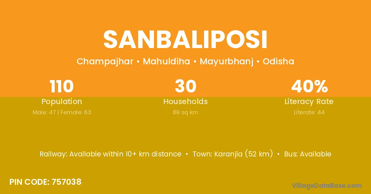 Karanjia (52 km) is the nearest town to Sanbaliposi village for major economic activities and is located approximately 52 km away.