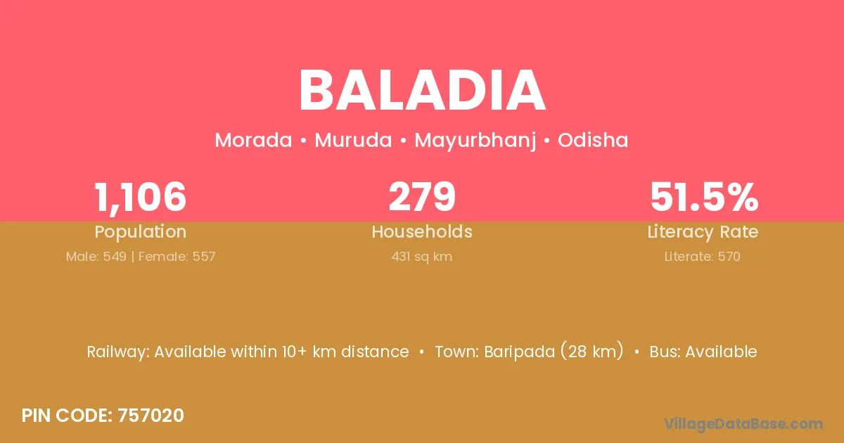 Baripada (28 km) is the nearest town to Baladia village for major economic activities and is located approximately 28 km away.