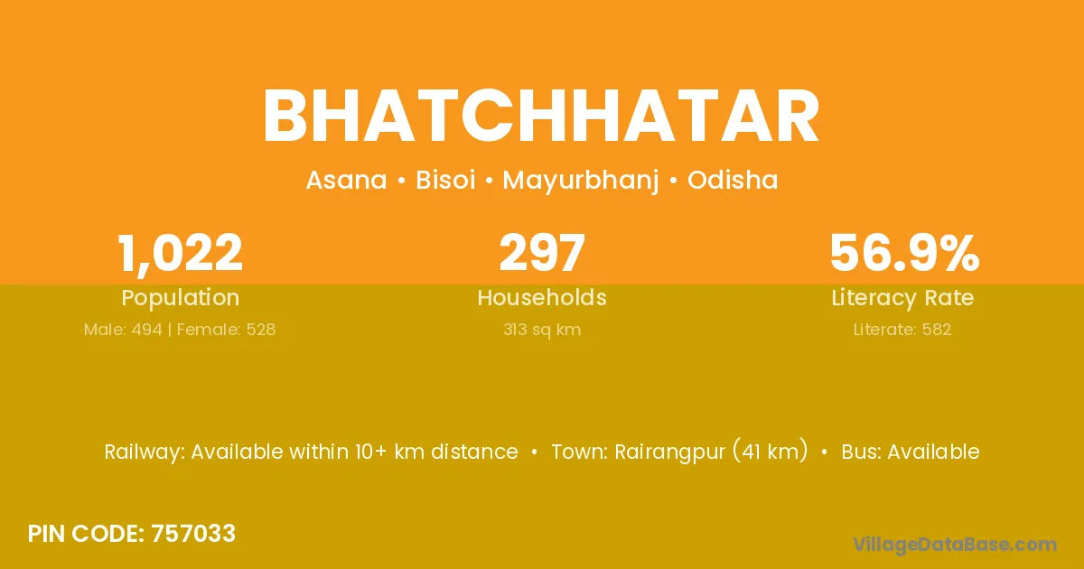 Baripada (38 km) is the nearest town to Bhatchhatar village for major economic activities and is located approximately 38 km away.