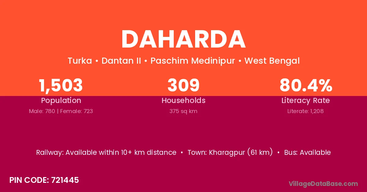 Baripada (6 km) is the nearest town to Daharda village for major economic activities and is located approximately 6 km away.