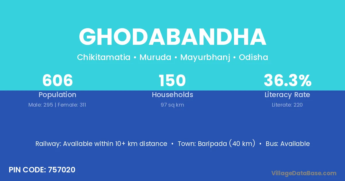 Baripada (40 km) is the nearest town to Ghodabandha village for major economic activities and is located approximately 40 km away.