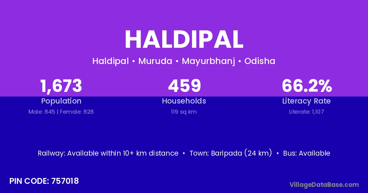 Baripada (24 km) is the nearest town to Haldipal village for major economic activities and is located approximately 24 km away.