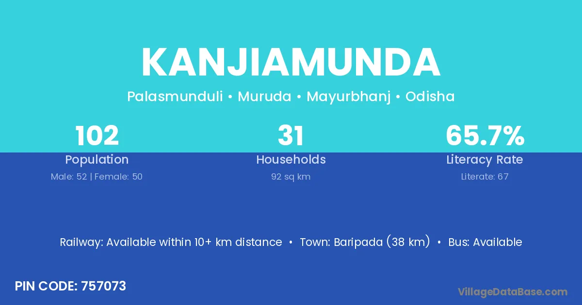 Baripada (38 km) is the nearest town to Kanjiamunda village for major economic activities and is located approximately 38 km away.