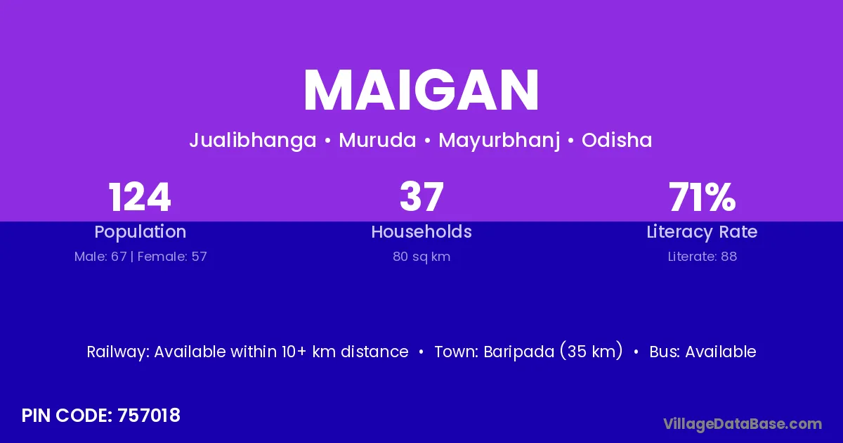 Baripada (35 km) is the nearest town to Maigan village for major economic activities and is located approximately 35 km away.