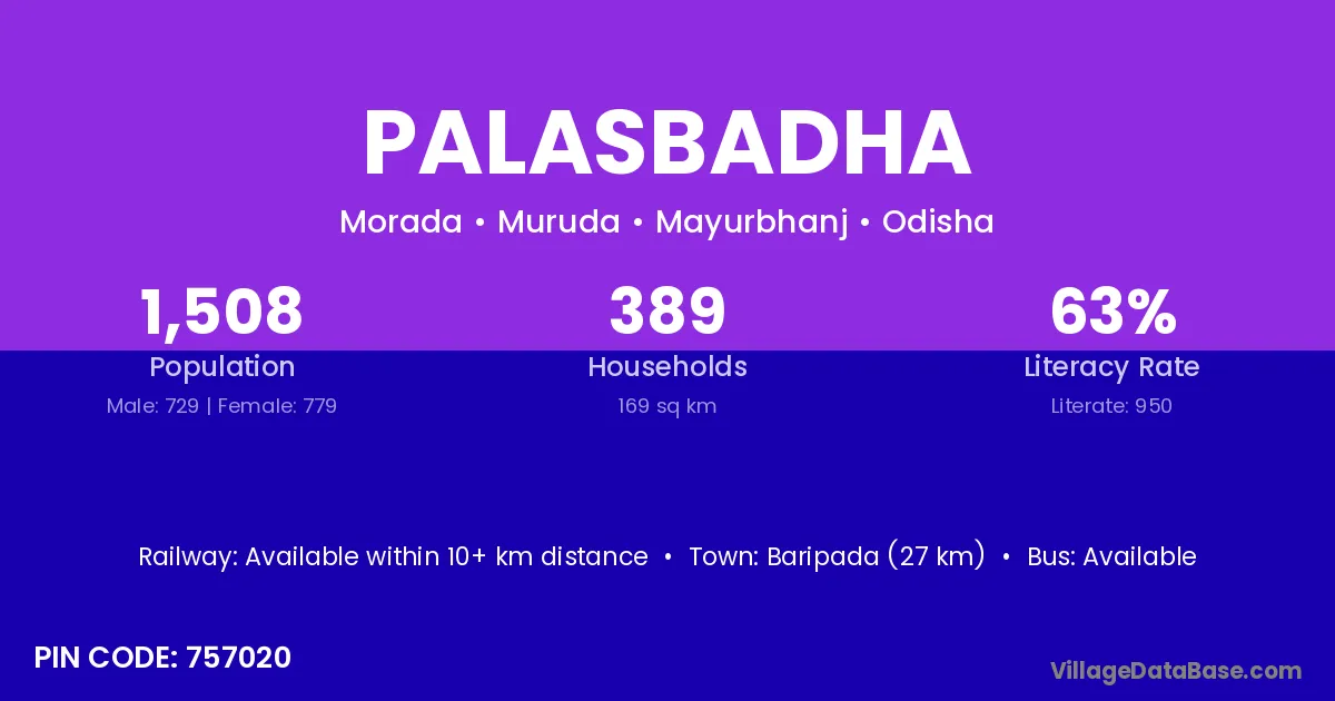 Palasbadha village has a total population of 1,508 people, of which 729 are males and 779 are females.
